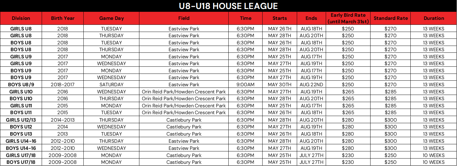Our House League program provides a structured league format where players are placed onto teams and will compete in games each week. This program is for players born in 2022-2008 (ages 4-18) of all abilities can participate. Please note players who play on a competitive rep soccer team cannot participate in our house league program. In alignment with Ontario Soccer’s Long-Term Player Development Model and Matrix and our Technical philosophy, rep players of all ages (U8-U18) are ineligible to play in our summer house league program.
