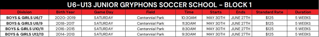 Please review the Junior Gryphons Soccer School Block 1 chart below. Please note that we will be running 2 blocks of JGSS this summer. Each block will be 5-weeks in length. Dates and times are based on year of birth. Please note that Guelph Soccer reserves the right to change days of play, start times, locations, and/or combine any age groups at any time.